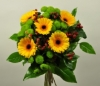 Míchaná kulatá kytice s gerberami, santinami a třezalkou doplněná listy salalu v oblíbené žluto-červeno-zelené kombinaci.