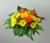Aranžmá ze živých řezaných květin v aranžovací hmotě, která zajišťuje dluhou trvanlivost květin. Kulatá vypichovaná miska ve složení: růže, chryzantéma, hypericum a listy rumory.