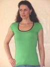 Nabízíme tričko do tvaru U motýlkový rukáv. Zelené tričko s tmavě modrou paspulí. Dostupné velikosti 44,46,48,50,52.