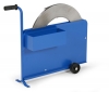 Pojízdný odvíječ pro ocelovou pásku. Snadno přemístitelný. Odvíjení ocelové pásky po ložiscích. Standardně pro šířku pásky do 20 mm (pro širší pásky - na vyžádání). Plechová krabice pro spony a páskovačku.