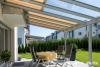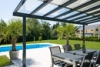 Robustní práškově lakovaná hliníková konstrukce s integrovaným bezpečnostním sklem nabízí celoroční ochranu před deštěm, případně i sněhem. Clona je vhodná pro zastřešení terasy, jako přístřešek pro auta či kuřácký kout.