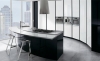 Moderní kuchyně na míru v netradičním půlkruhovém provedení.Bílé lesklé dveře v kombinaci s lesklou černou jsou vhodnou elegantní kombinací.